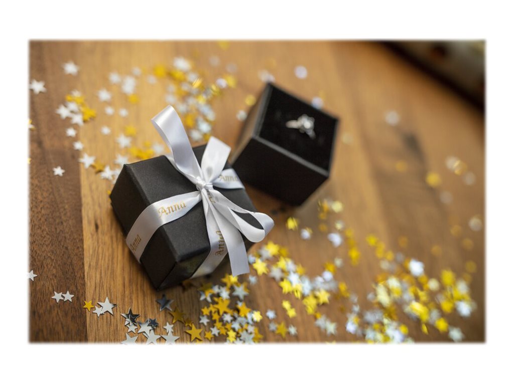 Met de TZe-R234 maakt u snel stijlvolle linten met scherpe, professionele opdruk. Dit prachtige goud op wit premium lint heeft dankzij de glanzende afwerking een mooie, luxe uitstraling en is perfect geschikt voor het inpakken van belangrijke cadeautjes en bijzondere hobbyprojecten.