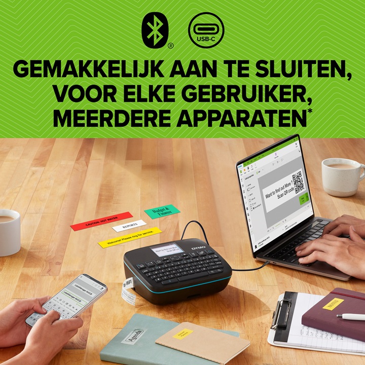 Moderne draagbare Dymo labelmaker met USB en Bluetooth verbinding voor D1 van 6 - 24 mm breed. Inclusief accu en USB kabel.