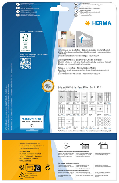 - Zelfklevende etiketten op A4-vellen, etiketformaat 17,8x10mm wit verwijderbaar, 25 vel per verpakking. Stevig hechtend op alle gladde, droge, onbeschadigde en stofvrije oppervlakken. Te verwijderen zonder resten achter te laten en zonder de ondergrond te beschadigen. Ideaal voor het tijdelijk of wisselend labelen en voor oppervlakken die niet mogen worden beschadigd. Zeer goede drukresultaten op alle laser- en inkjetprinters, kopieerapparaten, kleurenlaserprinters en kleurenkopieerapparaten. Storingvrije verwerking dankzij veiligheidsrand rondom en optimale vlakligging. Milieuvriendelijk: FSC® Mix Credit-gecertificeerd, chloorvrij gebleekt, oplosmiddelvrije contactlijm. Etiketten zijn 100 % recyclebaar via het oud papier, verpakking van gerecycled karton. Gratis softwareoplossingen: www.herma.com/software.