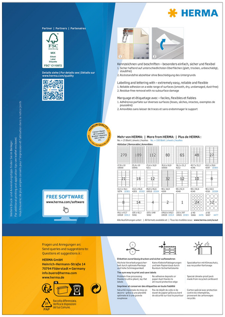 - Zelfklevende etiketten op A4-vellen, Ø 60 mm rond wit verwijderbaar, 100 vel per verpakking. Stevig hechtend op alle gladde, droge, onbeschadigde en stofvrije oppervlakken. Te verwijderen zonder resten achter te laten en zonder de ondergrond te beschadigen. Ideaal voor het tijdelijk of wisselend labelen en voor oppervlakken die niet mogen worden beschadigd. Zeer goede drukresultaten op alle laser- en inkjetprinters, kopieerapparaten, kleurenlaserprinters en kleurenkopieerapparaten. Storingvrije verwerking dankzij veiligheidsrand rondom en optimale vlakligging. Milieuvriendelijk: FSC® Mix Credit-gecertificeerd, chloorvrij gebleekt, oplosmiddelvrije contactlijm. Etiketten zijn 100 % recyclebaar via het oud papier, verpakking van gerecycled karton. Gratis softwareoplossingen: www.herma.com/software.