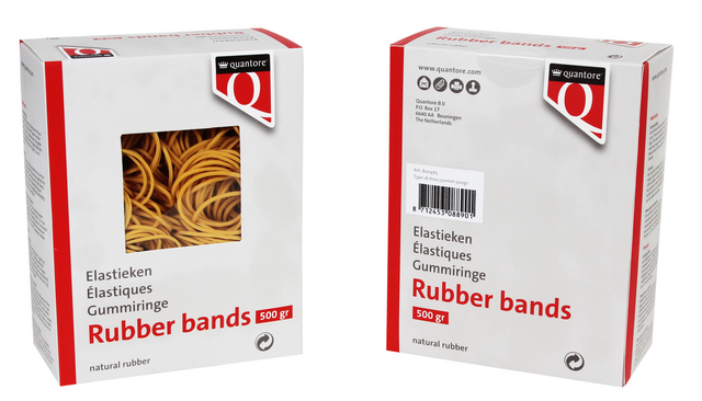 - De Quantore elastieken in maat 16 zijn ideaal voor het bundelen van kleine documenten, producten of kaarten. Met een afmeting van 60x1,5x1mm bieden deze bruine elastiekjes een goede balans tussen flexibiliteit en stevigheid. Ze zijn gemaakt van 80% pararubber en zijn daarmee een verantwoorde keuze voor dagelijks gebruik. Verpakt in een doos van 500 gram, perfect voor intensief gebruik op kantoor, op school of in het magazijn.Kenmerken: