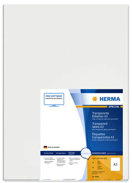 Eigenschappen "Etiket HERMA 8694 A3 297x420mm transparant 50 stuks"